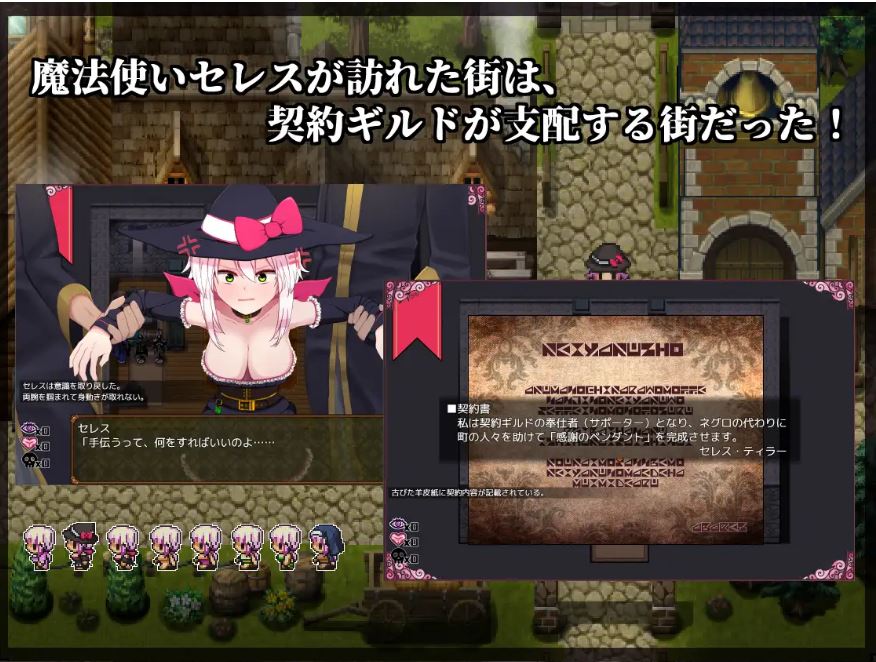 魔法使赛雷斯所造访的城镇,是契约公会所支配的城镇!被欺骗而被迫签约的赛雷斯,必须得到居民们的“感谢”!真丢脸!太色情了!契约会做很多事!快节奏RPG!